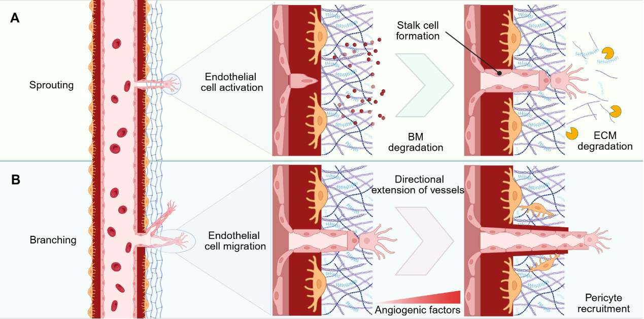 血管生成是指从既有血管系统中萌发新生血管的生物学过程,在胚胎发育、组织再生及伤口愈合等生理过程中发挥着不可或缺的作用。然而,血管生成调控的失衡与多种病理状态密切相关,包括恶性肿瘤、缺血性心血管疾病及慢性炎症性疾病等。近年来,研究表明血管内皮生长因子(VEGF)、成纤维细胞生长因子(FGF)及血小板衍生生长因子(PDGF)等关键细胞因子在血管生成调控网络中占据核心地位。抗血管生成疗法主要通过靶向抑制VEGF信号通路,阻断内皮细胞增殖、迁移及血管腔形成,从而抑制肿瘤血管化或病理性的新生血管形成。与之相对,促血管生成疗法则通过激活VEGF、FGF等信号通路,促进内皮细胞活化及血管新生,以改善缺血性疾病的组织灌注及功能修复。越来越多的实验证据表明,抗血管生成与促血管生成通路之间存在复杂的交互作用,这种动态平衡的失调在多种疾病的病理生理过程中扮演着关键角色,并为靶向治疗提供了潜在的分子靶点。